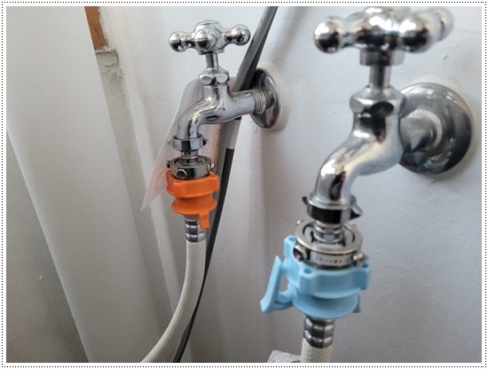 이번에는 세탁기로 세탁을 한 후 급수 배관을 수도꼭지에서 분리하여 물을 빼뒀습니다.