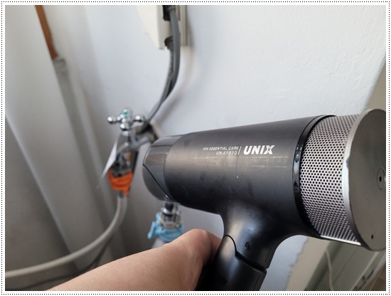 한번에 오랫동안 계속해서 뜨거운 바람을 사용하면 드라이기가 과열이 될 수 있으니 몇분 사용하다가 잠깐 멈춰서 드라이기 열을 식혀준 후 다시 뜨거운 바람으로 급수 배관부위를 녹여줍니다.