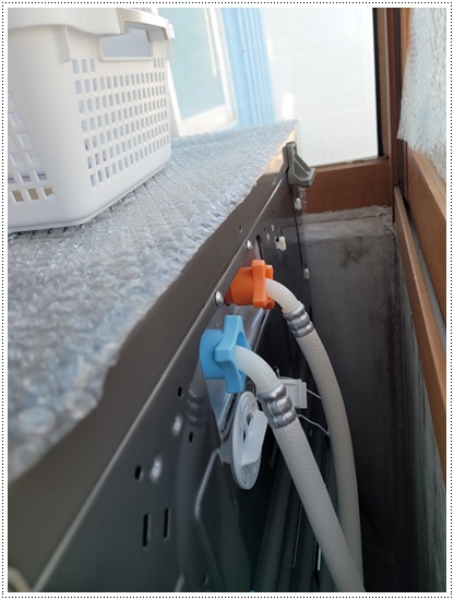 이번에는 세탁기로 세탁을 한 후 급수 배관을 수도꼭지에서 분리하여 물을 빼뒀습니다.