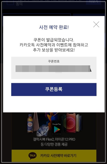 사전예약 신청을 누르면 위와 같이 쿠폰이 지급이됩니다.