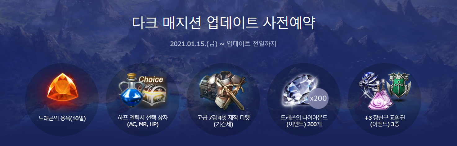 사전예약 기간은 1월 15일 부터 다크매지션 업데이트 전일까지 입니다.
