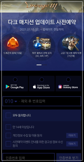 사전예약을 한 분들은 다크매지션 업데이트시 사전예약 전화번호로 업데이트 안내 및 사전예약 보상안내를 문자로 받으실 수 있습니다.