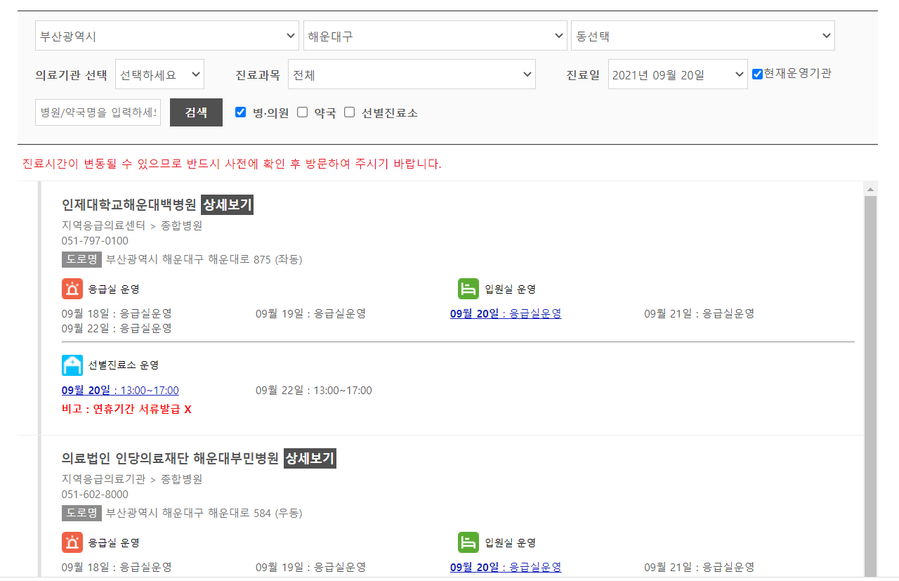 아픈사람이 있더라도 당황하지마시고 검색 후 미리 연락해보신 후 의료기관에 방문하시기 바랍니다.