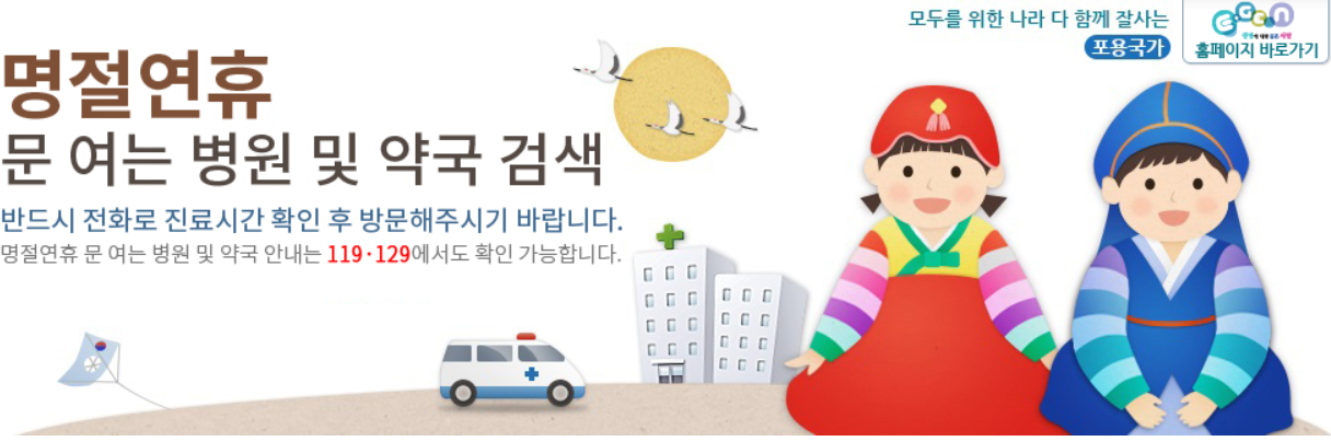 명절 연휴 문 여는 병원 및 약국을 검색 할 수 있습니다.